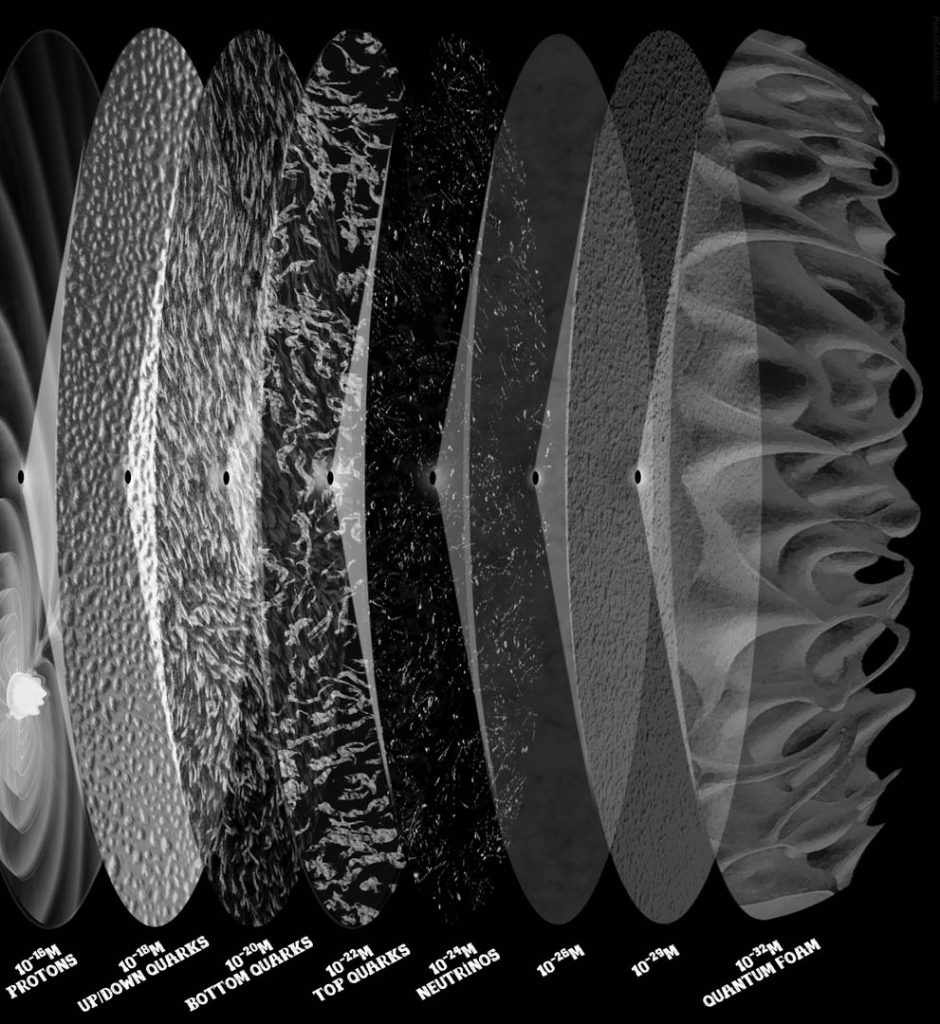 At 10^-32m is thought to exist a foam of twisted spacetime (Quantum foam).