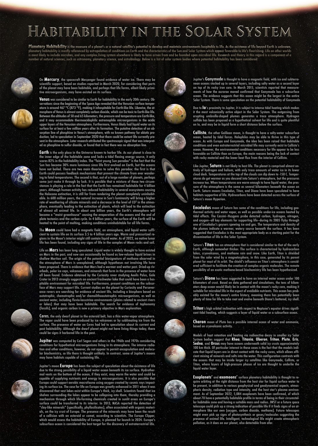 Exoplanets’ and exomoons‘ surface planetary habitability is thought to require orbiting at the right distance from the host star for liquid surface water to be present, in addition to various geophysical and geodynamical aspects, atmospheric density, radiation type and intensity, and the best star’s plasma environment. As of September 2022, 5,084 exoplanets have been confirmed, of which about 70 have a potentially habitable profile in terms of being in their circumstellar habitable zone and having a suitable mass and radius. JWST or a future space telescope could pick up a strong indication of possible life if it finds signs of an atmosphere like our own (oxygen, carbon dioxide, methane). Future telescopes might even pick up signs of photosynthesis or gases/molecules suggesting the presence of animal life. Intelligent, technological life might create atmospheric pollution, as it does on our planet, also detectable from afar.