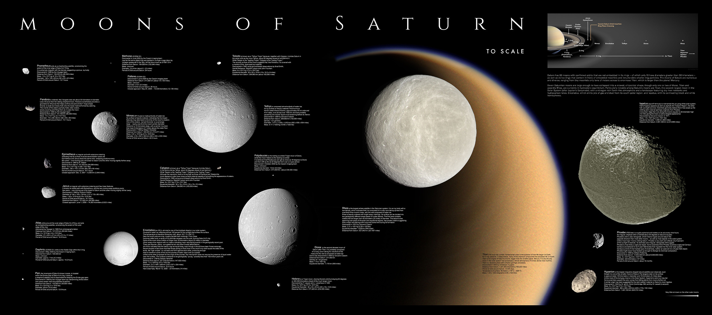 Fine design infographic showing major moons of Saturn to scale and their characteristics. This Pablo Carlos Budassi new design is inspired by NASA/JPL old graphic. May 2025 Updated.
