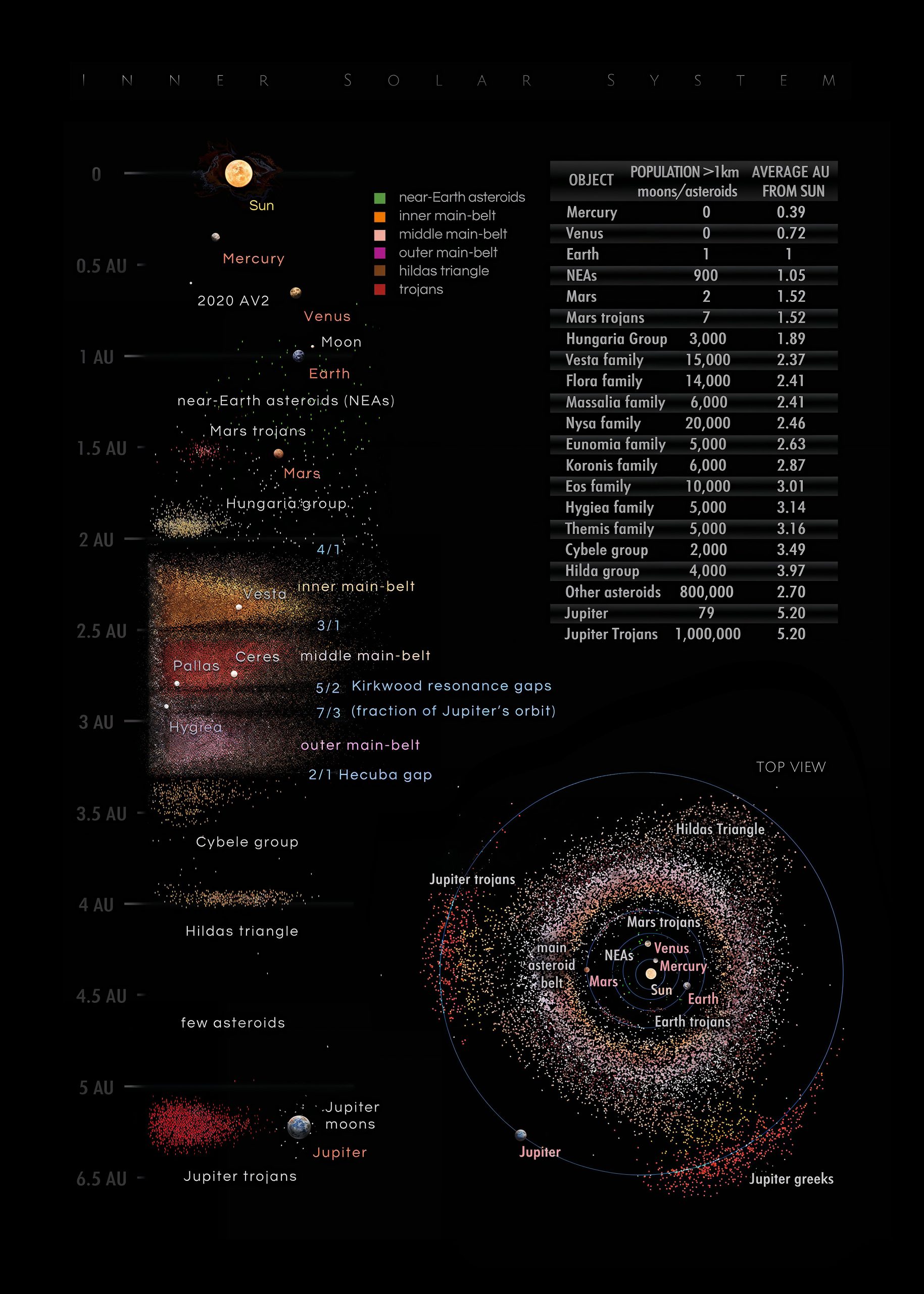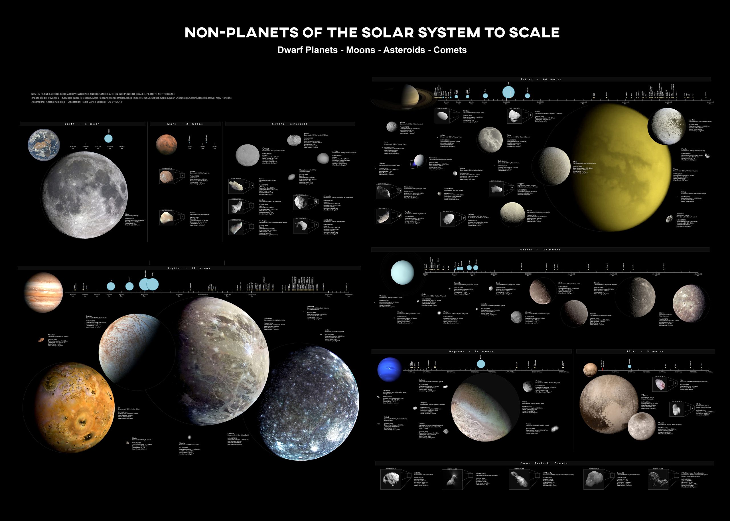 The largest non-planets of the Solar System to scale, including natural satellites, dwarf planets, asteroids, and minor-planet moons. Photomontage created from several images taken by space probes and telescopes. Original by Antonio Ciccolella, adapted in poster format by P. Budassi in 2020.
