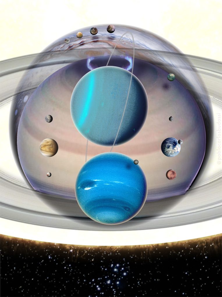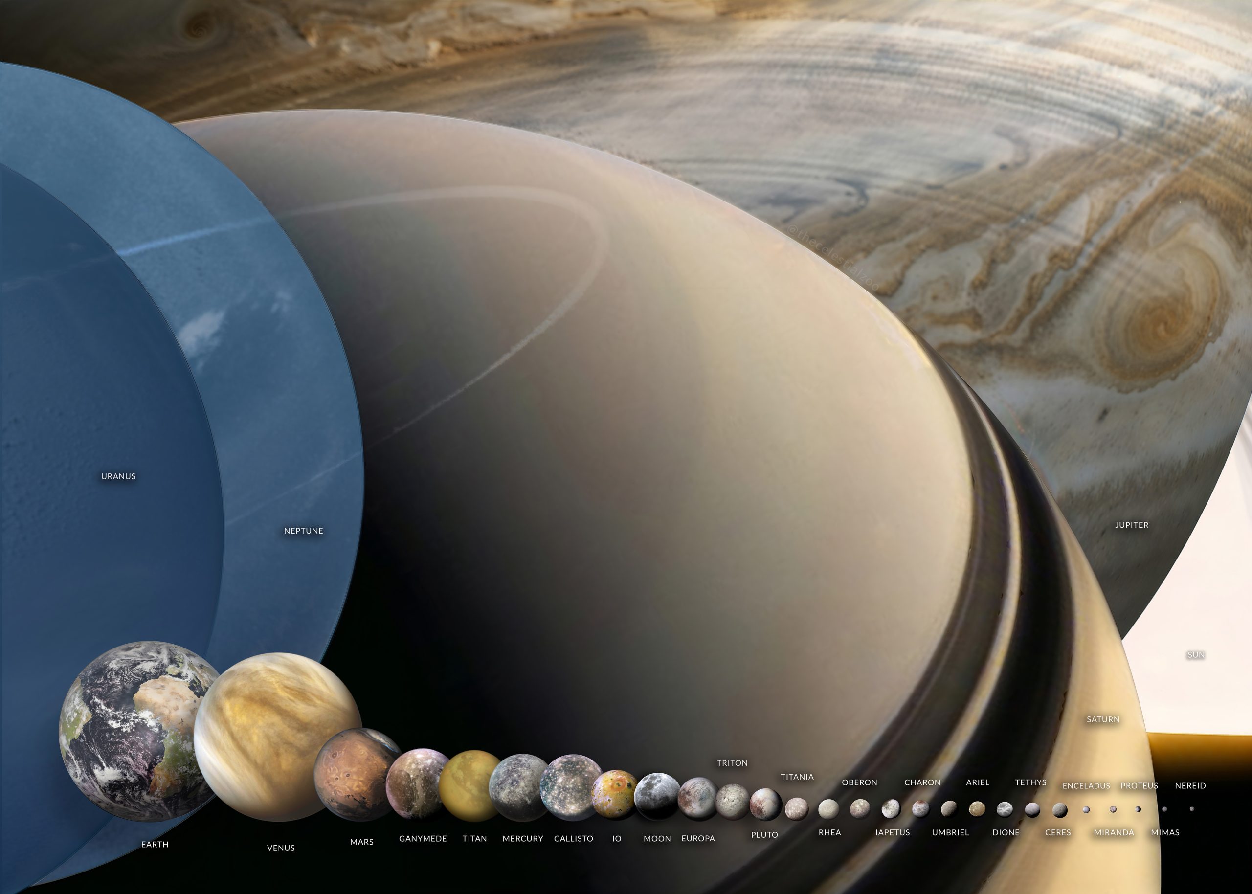 This illustration compares the relative sizes of planets and major moons in the solar system, arranging them side by side to highlight their scale differences. Smaller bodies like Pluto, Eris, and various icy moons are shown alongside Earth, Venus, and Mars, while the giant moons Ganymede, Titan, and Callisto appear nearly planet-sized. Behind them, the immense bulk of Jupiter and Saturn dominates the background, with translucent overlays marking the sizes of Uranus and Neptune. Altogether, the image emphasizes the striking contrast between terrestrial worlds, large moons, and the gas giants, offering a clear sense of proportion across the solar system. Designed by P. Budassi in 2024. Images by NASA/ESA.