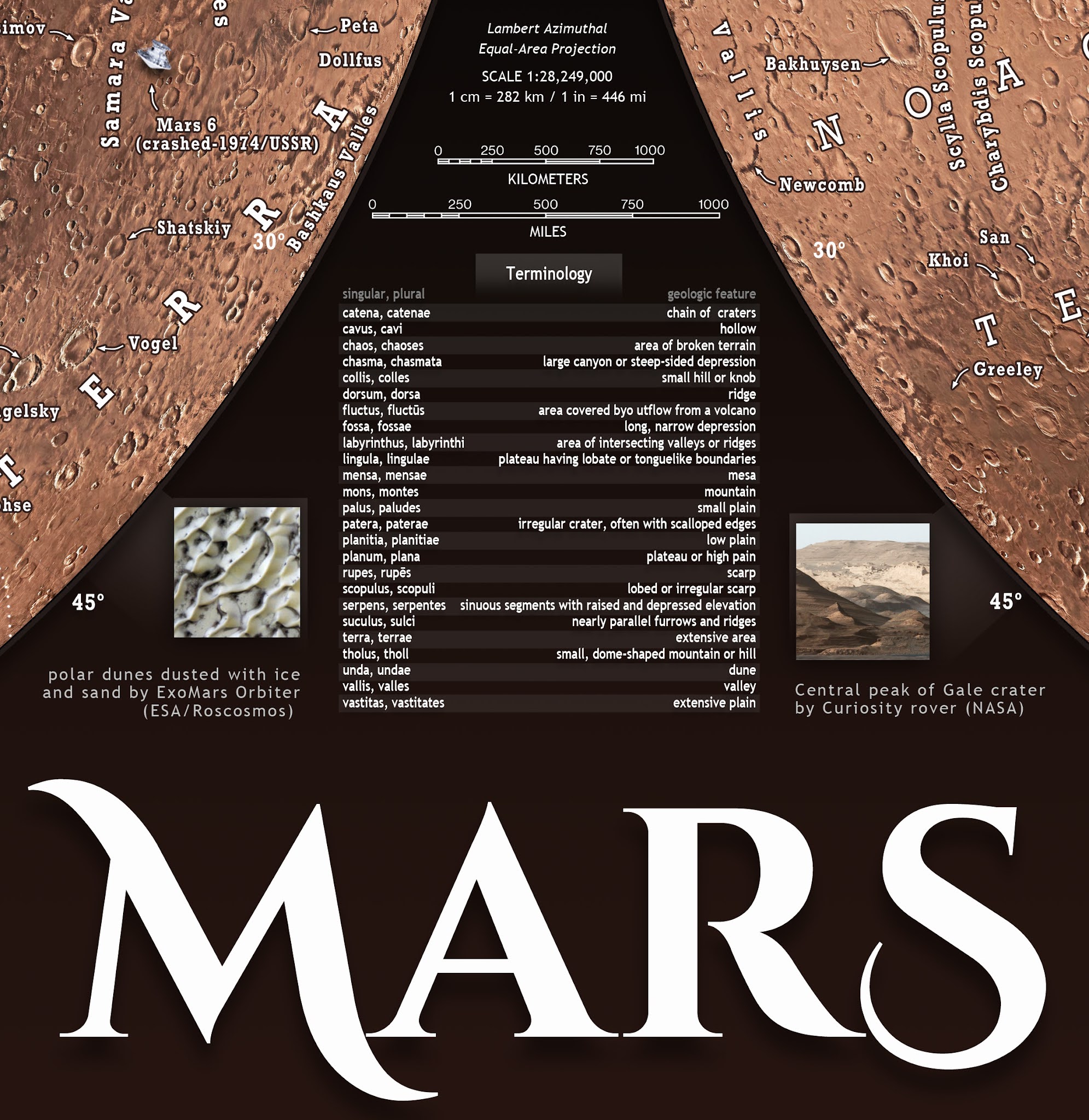 The map is based on the colorized mosaic by NASA AMES, which integrates the Viking colorized mosaic with the latest Mars Digital Image Model (MDIM 2.1). The projection was processed using G.Projector software from NASA Goddard Institute for Space Studies, which utilizes several open-source Java libraries.