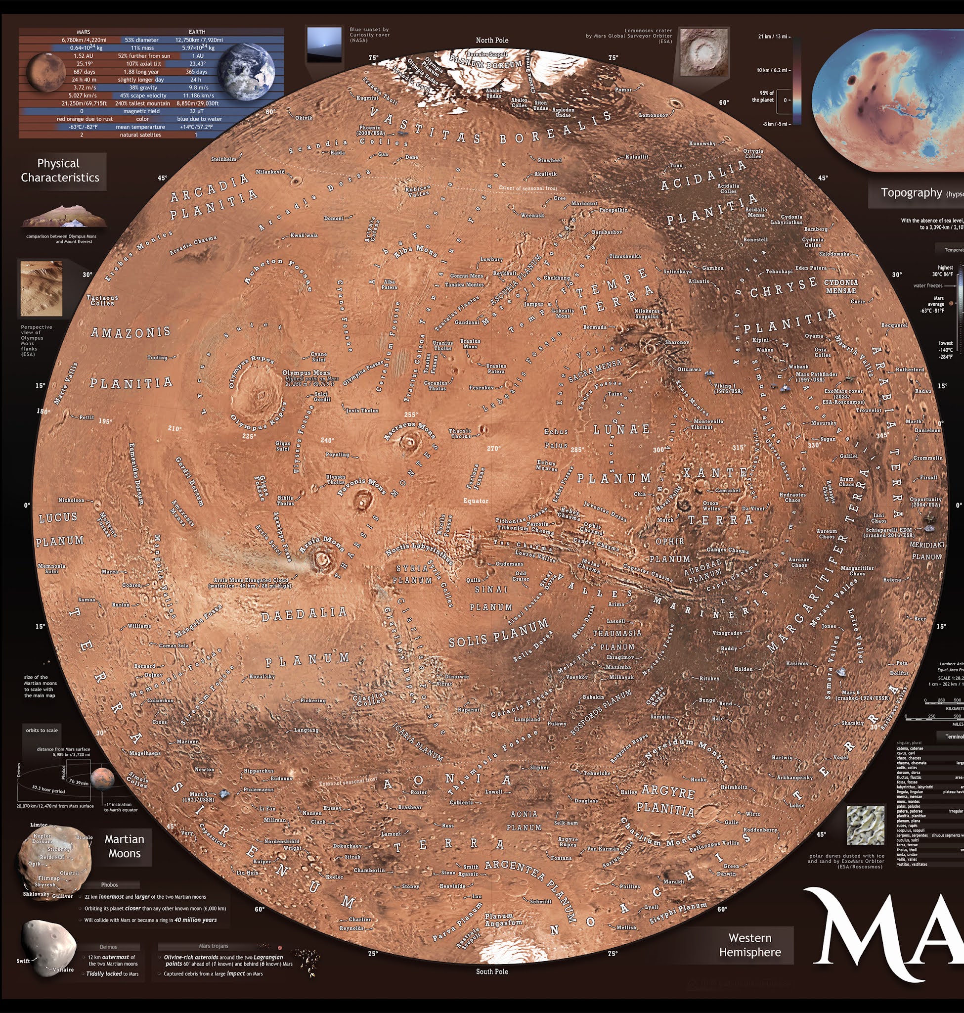 In the coming years of the new space age, as we become a multiplanetary species, the “Red Pearl” will be more present than ever in our lives and we should become familiar with it. This detailed map of fine design in a study or living room would be a good starting point!