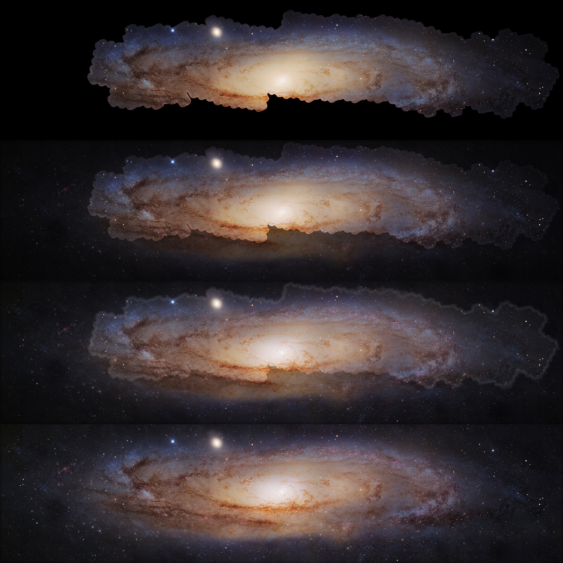 To complete the composition and depict the galaxy’s entire disk, Pablo filled in missing regions with enhanced images captured by astronomers Kees Scherer and Stephen Rahn. The full panorama canvas is 50270 x 12850 pixels or 646 megapixels.