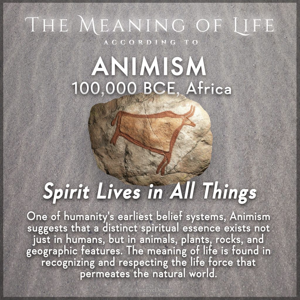 One of humanity’s earliest belief systems, Animism suggests that a distinct spiritual essence exists not just in humans, but in animals, plants, rocks, and geographic features. The meaning of life is found in recognizing and respecting the life force that permeates the natural world.