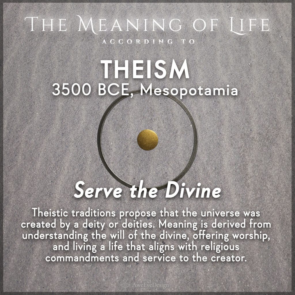 Theistic traditions propose that the universe was created by a deity or deities. Meaning is derived from understanding the will of the divine, offering worship, and living a life that aligns with religious commandments and service to the creator.