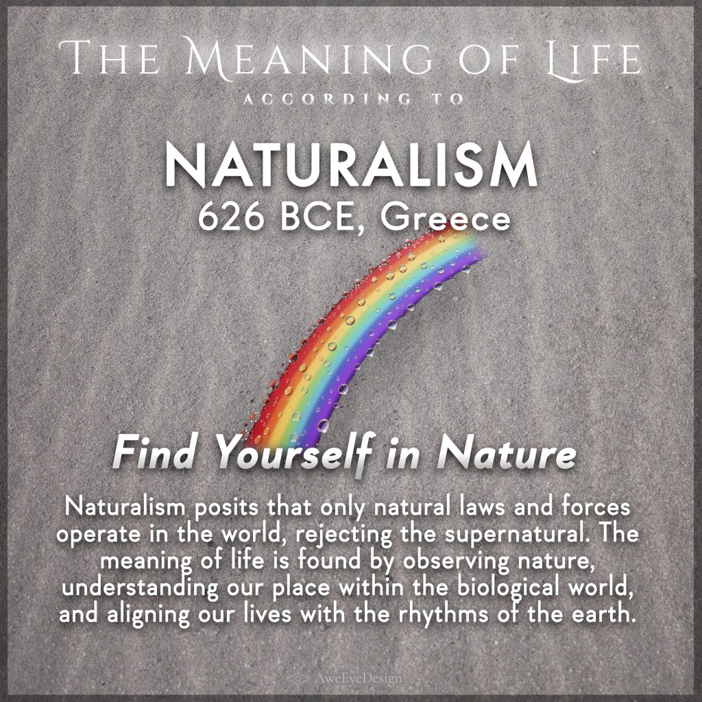 Naturalism posits that only natural laws and forces operate in the world, rejecting the supernatural. The meaning of life is found by observing nature, understanding our place within the biological world, and aligning our lives with the rhythms of the earth.
