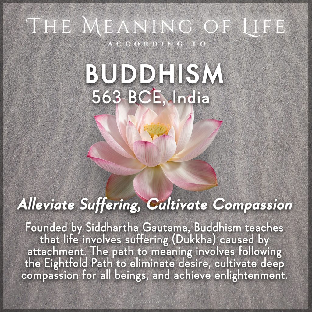 Founded by Siddhartha Gautama, Buddhism teaches that life involves suffering (Dukkha) caused by attachment. The path to meaning involves following the Eightfold Path to eliminate desire, cultivate deep compassion for all beings, and achieve enlightenment.