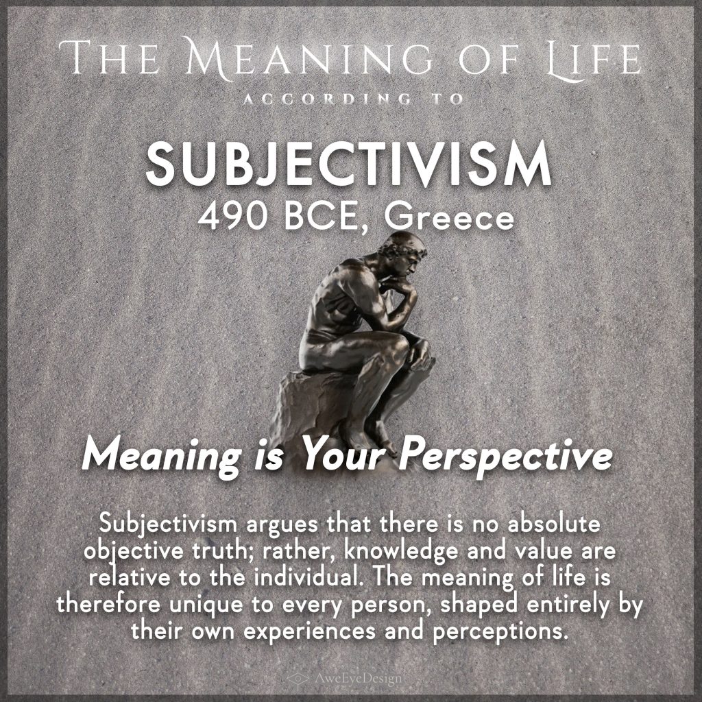 Subjectivism argues that there is no absolute objective truth; rather, knowledge and value are relative to the individual. The meaning of life is therefore unique to every person, shaped entirely by their own experiences and perceptions.