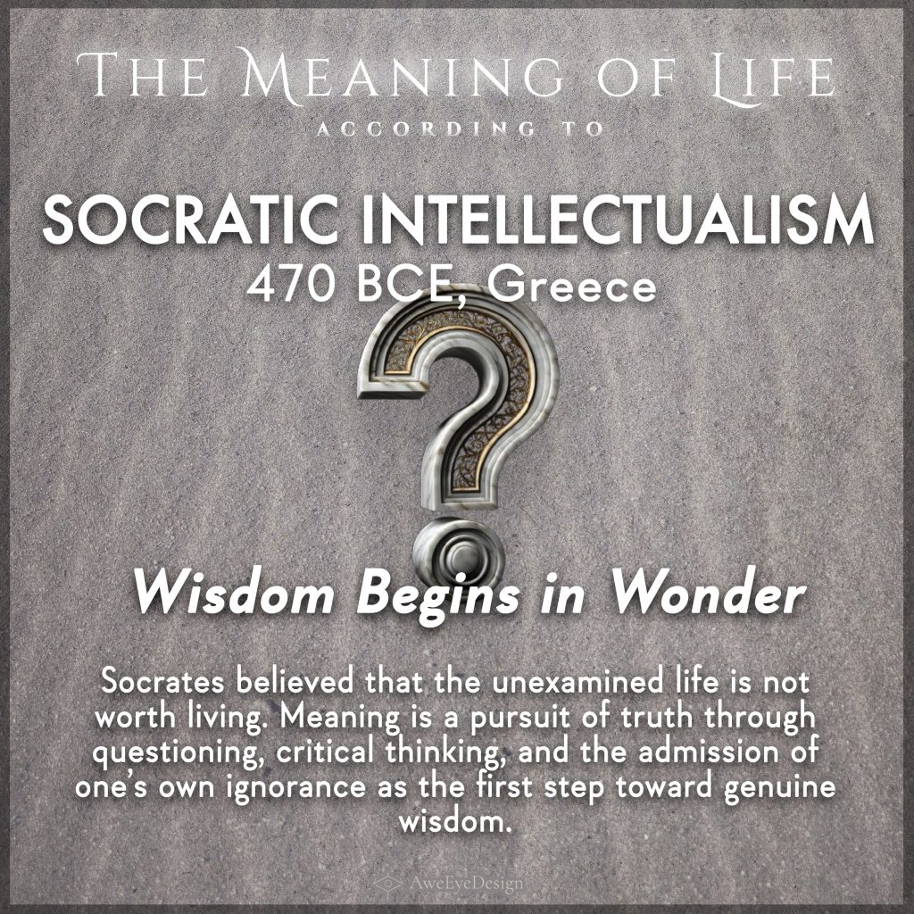Socrates believed that the unexamined life is not worth living. Meaning is a pursuit of truth through questioning, critical thinking, and the admission of one’s own ignorance as the first step toward genuine wisdom.