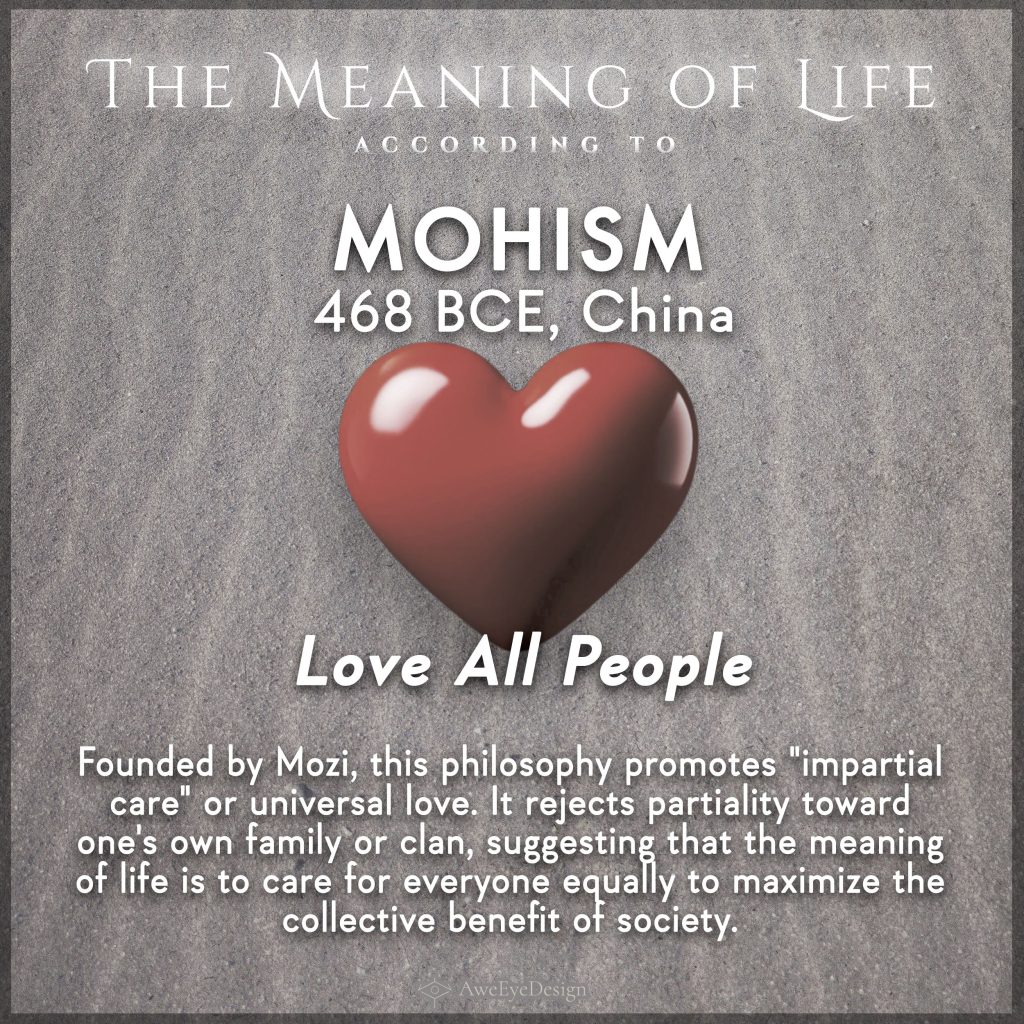 Founded by Mozi, this philosophy promotes “impartial care” or universal love. It rejects partiality toward one’s own family or clan, suggesting that the meaning of life is to care for everyone equally to maximize the collective benefit of society.