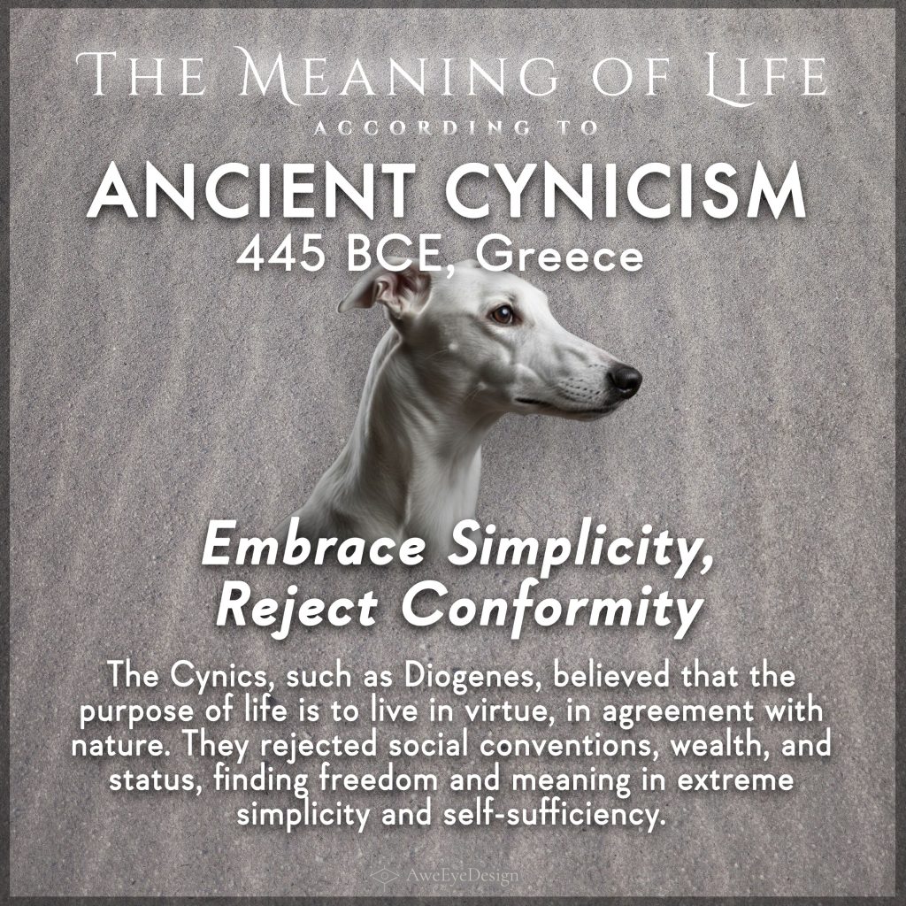 The Cynics, such as Diogenes, believed that the purpose of life is to live in virtue, in agreement with nature. They rejected social conventions, wealth, and status, finding freedom and meaning in extreme simplicity and self-sufficiency.