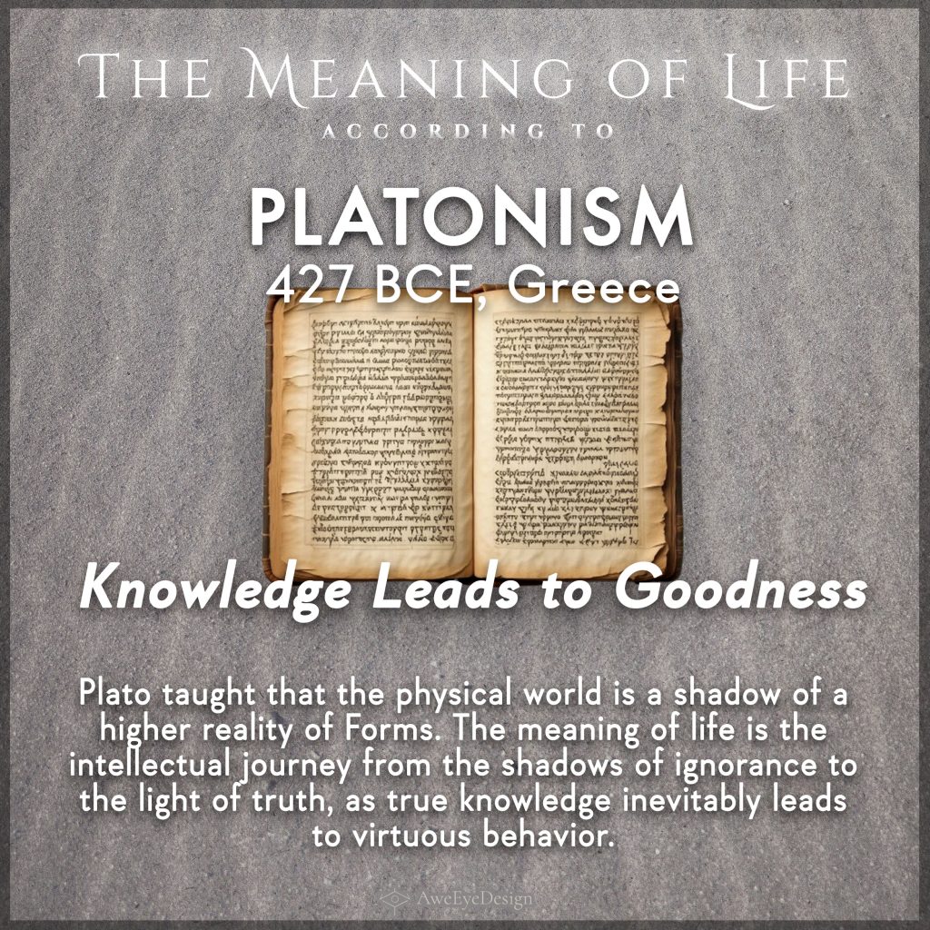 Plato taught that the physical world is a shadow of a higher reality of Forms. The meaning of life is the intellectual journey from the shadows of ignorance to the light of truth, as true knowledge inevitably leads to virtuous behavior.