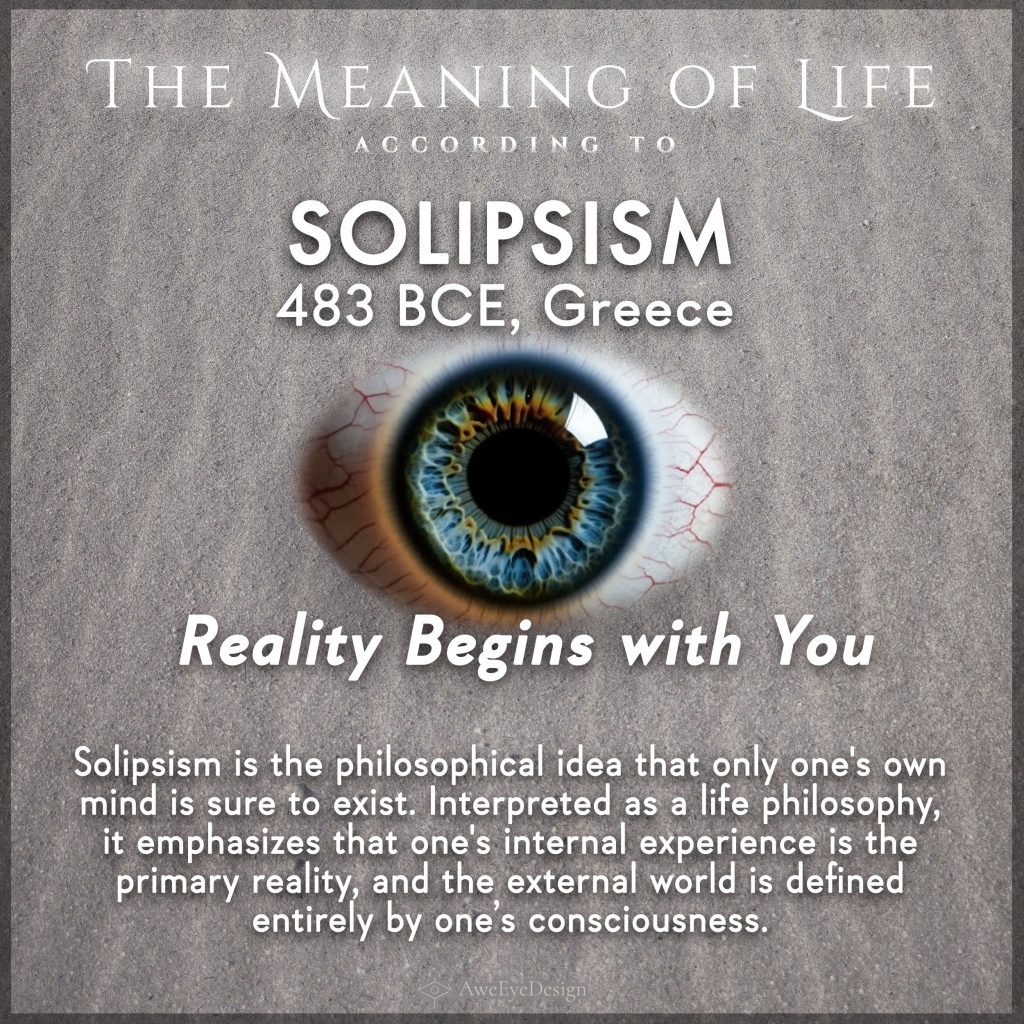 Solipsism is the philosophical idea that only one’s own mind is sure to exist. Interpreted as a life philosophy, it emphasizes that one’s internal experience is the primary reality, and the external world is defined entirely by one’s consciousness.