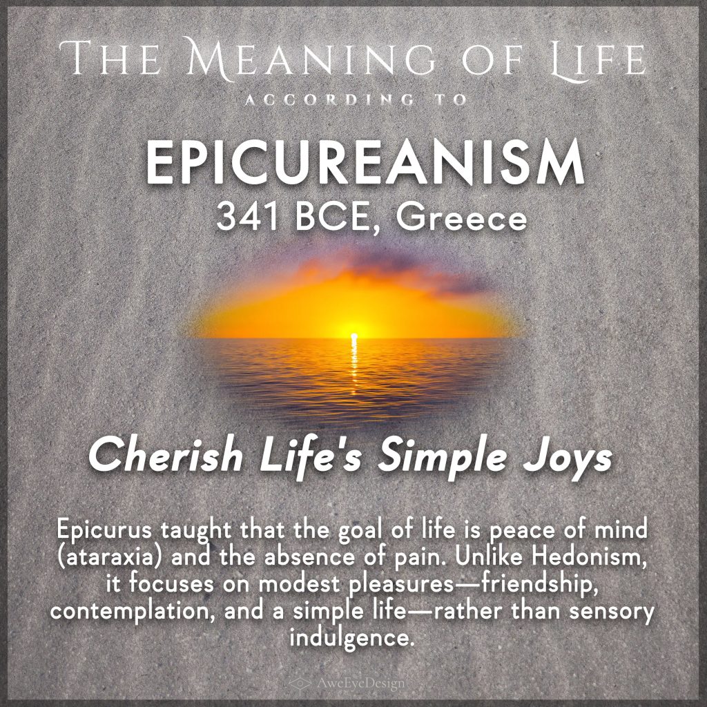 Epicurus taught that the goal of life is peace of mind (ataraxia) and the absence of pain. Unlike Hedonism, it focuses on modest pleasures—friendship, contemplation, and a simple life—rather than sensory indulgence.