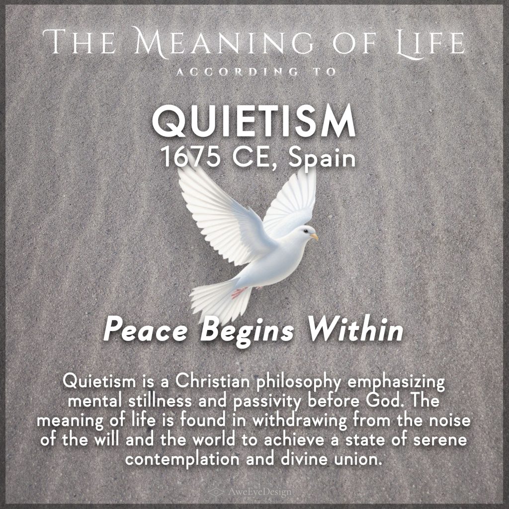 Quietism is a Christian philosophy emphasizing mental stillness and passivity before God. The meaning of life is found in withdrawing from the noise of the will and the world to achieve a state of serene contemplation and divine union.