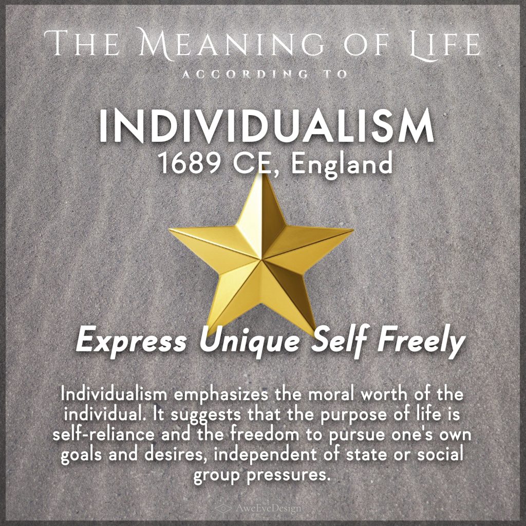 Individualism emphasizes the moral worth of the individual. It suggests that the purpose of life is self-reliance and the freedom to pursue one’s own goals and desires, independent of state or social group pressures.