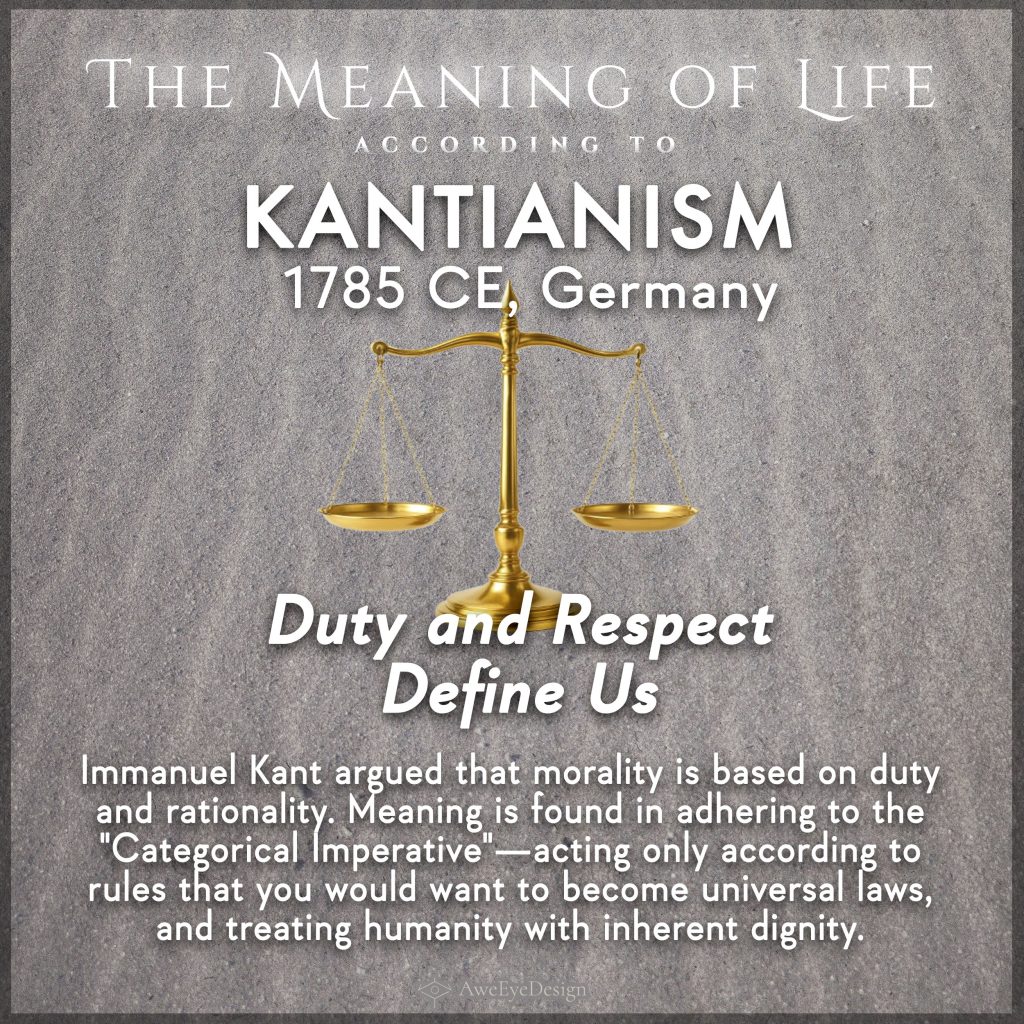 Immanuel Kant argued that morality is based on duty and rationality. Meaning is found in adhering to the “Categorical Imperative”—acting only according to rules that you would want to become universal laws, and treating humanity with inherent dignity.