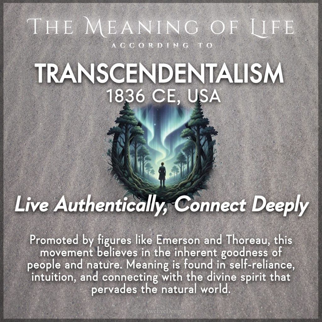 Promoted by figures like Emerson and Thoreau, this movement believes in the inherent goodness of people and nature. Meaning is found in self-reliance, intuition, and connecting with the divine spirit that pervades the natural world.