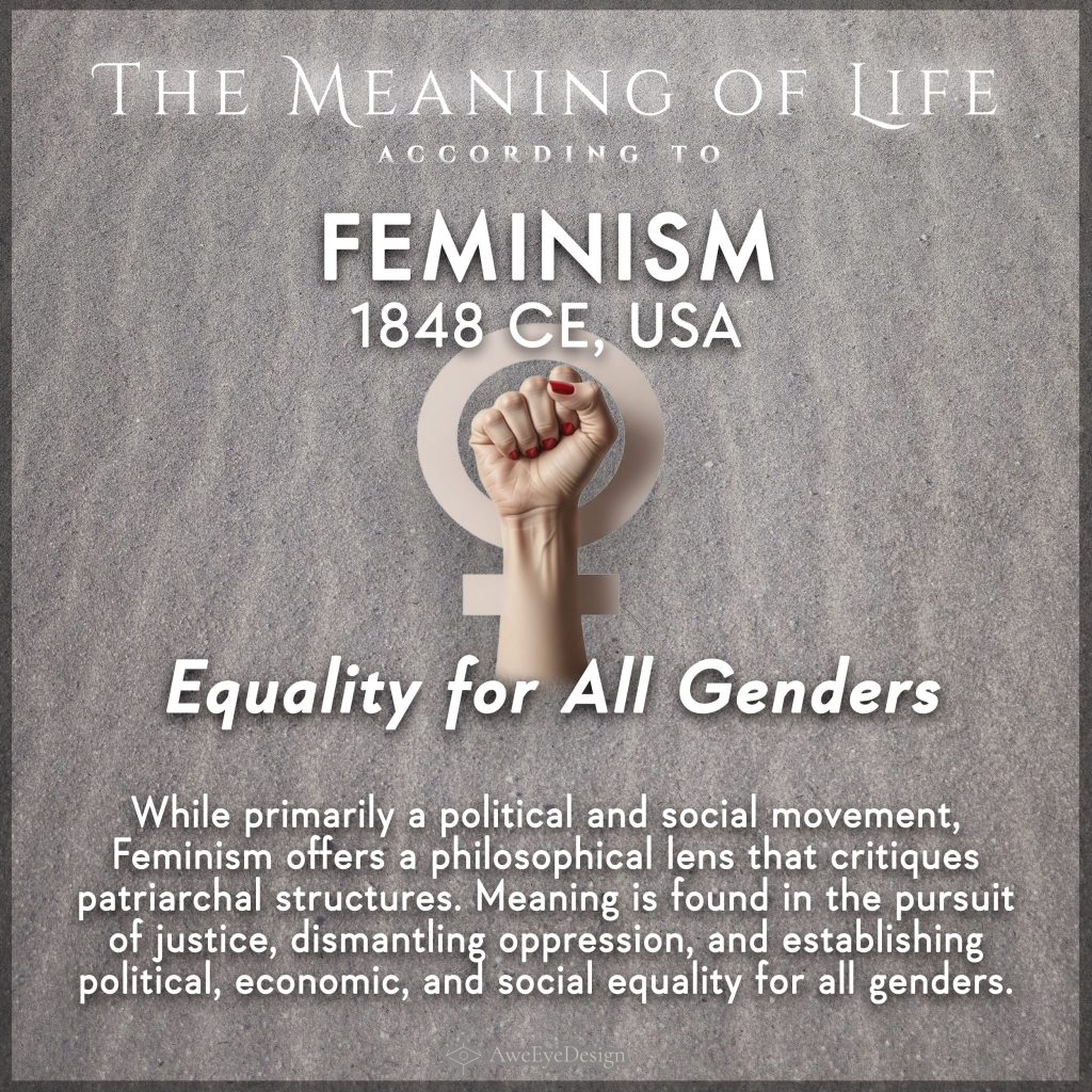 While primarily a political and social movement, Feminism offers a philosophical lens that critiques patriarchal structures. Meaning is found in the pursuit of justice, dismantling oppression, and establishing political, economic, and social equality for all genders.