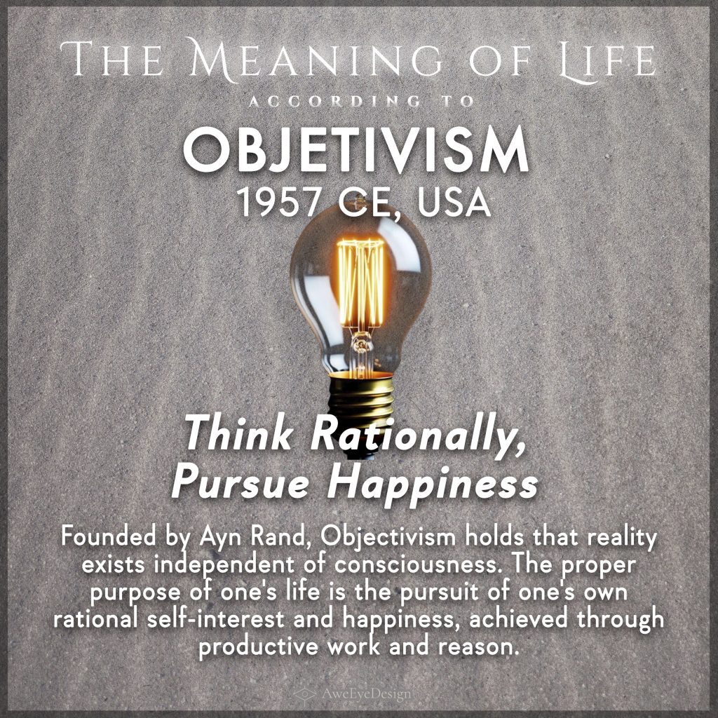 Founded by Ayn Rand, Objectivism holds that reality exists independent of consciousness. The proper purpose of one’s life is the pursuit of one’s own rational self-interest and happiness, achieved through productive work and reason.