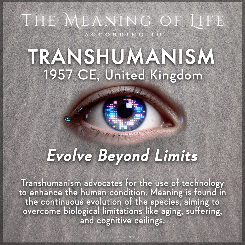 Transhumanism advocates for the use of technology to enhance the human condition. Meaning is found in the continuous evolution of the species, aiming to overcome biological limitations like aging, suffering, and cognitive ceilings.