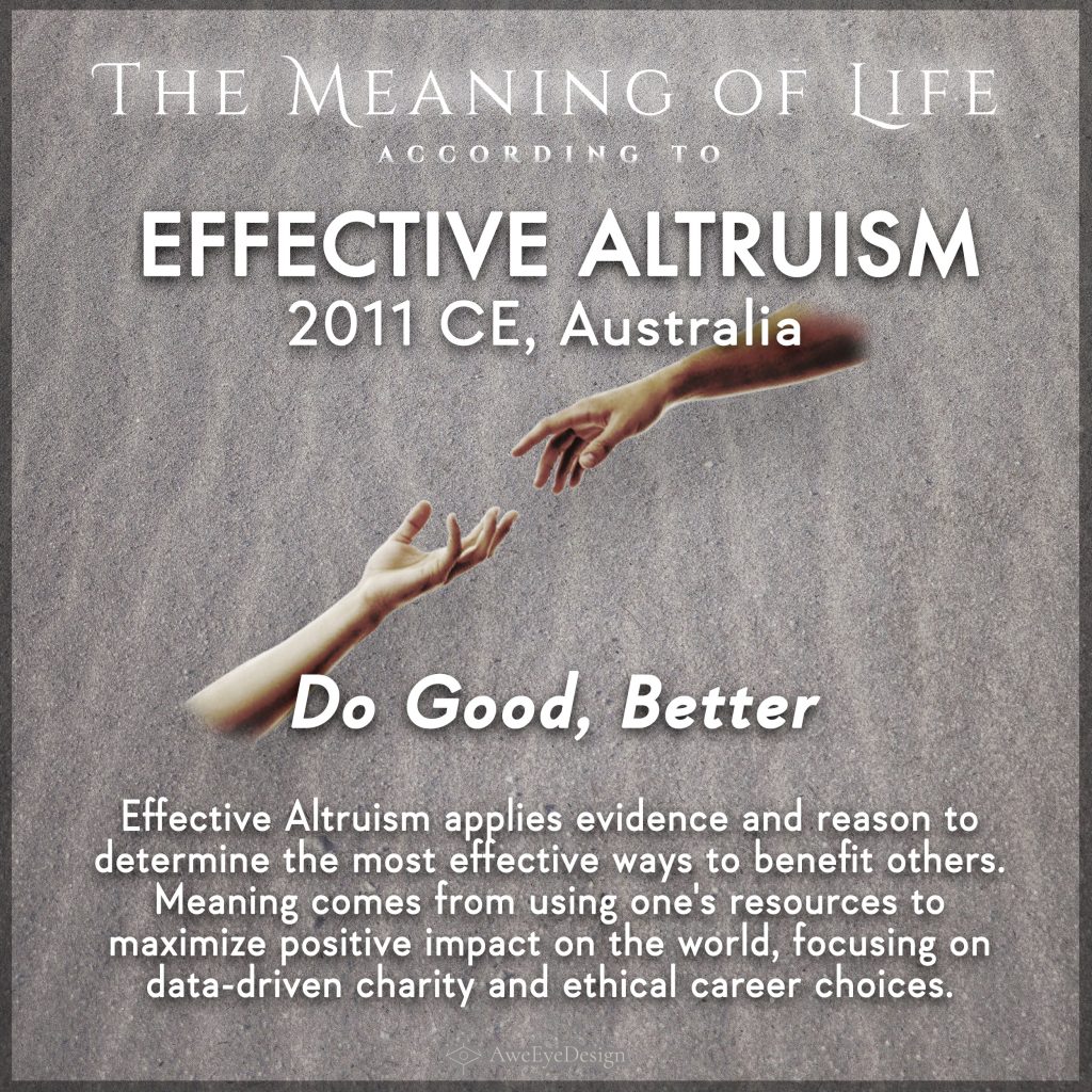 Effective Altruism applies evidence and reason to determine the most effective ways to benefit others. Meaning comes from using one’s resources to maximize positive impact on the world, focusing on data-driven charity and ethical career choices.