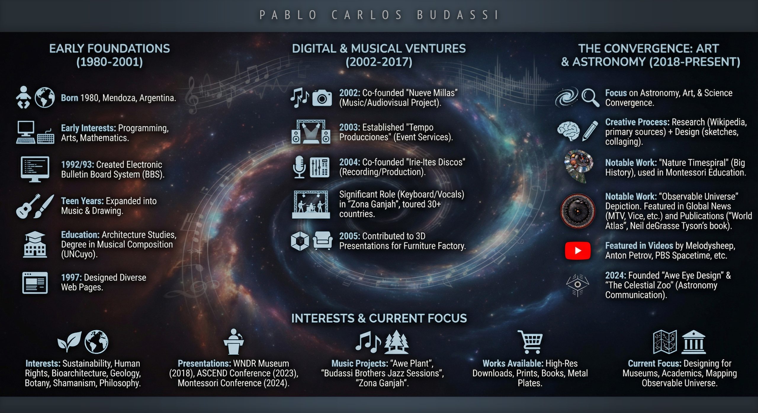 Pablo Budassi, born in Mendoza, Argentina in 1980, is an artist whose work encompasses various mediums and themes, including natural sciences and especially, astronomy. Displaying capability in arts and mathematics from early on, he received recognition for his programming skills in his junior years. As a teenager, his interests expanded into music and drawing.